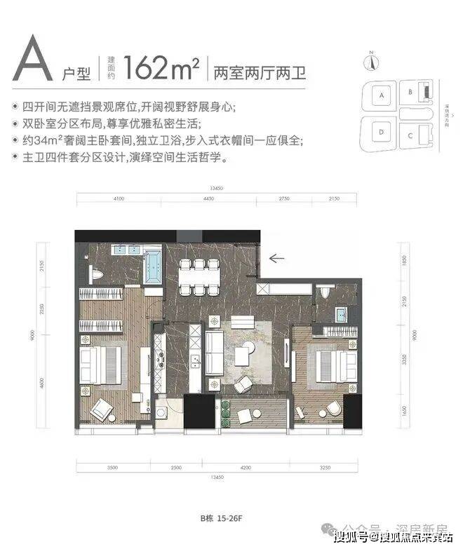 B户型:约164㎡2房2厅2卫:B栋15-26F(中区)端头户型,户型面积从约X平方米起,